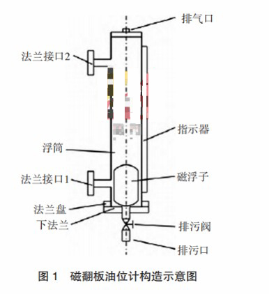 傳感器由干簧管和電阻組成,當磁性浮子位置變換后,磁場通過器壁帶動傳感器內干簧管觸電吸合,干簧管吸合位置決定回路阻抗的大小,一般為10mm 1組,回路電阻大小正好與液位高低成正比,這樣置于傳感器外殼內的變送器將電阻信號轉換為標準電流信號,送至監(jiān)控系統(tǒng)。為保證上送信號的及時性,根據需要在雙色磁翻板液位計管壁上設置數個磁性開關。當磁性浮子上升或下降通過這些磁性開關所處位置時,將觸發(fā)磁性開關內部觸點動作,以開關量形式將報警信號傳輸至監(jiān)控系統(tǒng)。磁翻板油位計構造見圖1。